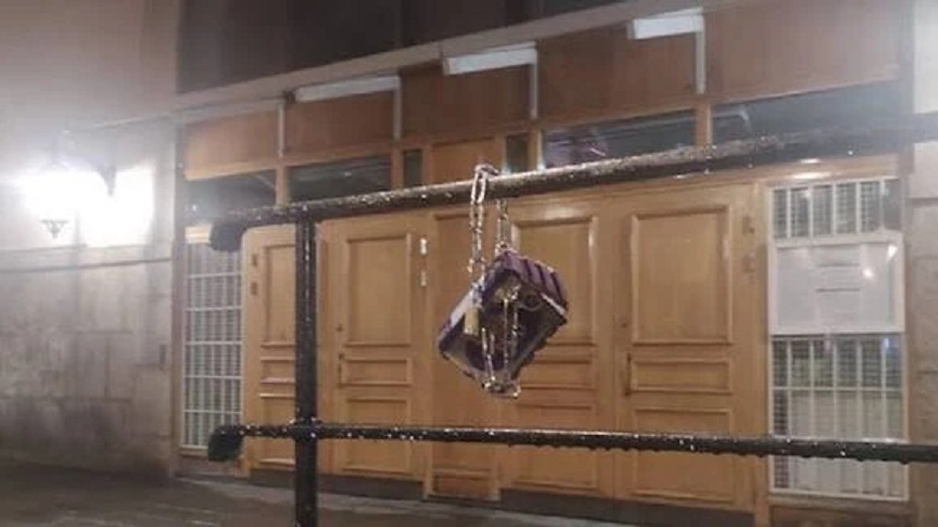 وأفاد بيان صادر عن إدارة المسجد، السبت، أن نسخة من القرآن الكريم وُجدت مربوطة بسلاسل إلى درابزين السلالم المؤدية إلى المسجد، وعليها ست ثقوب ناجمة عن طلقات نارية.
