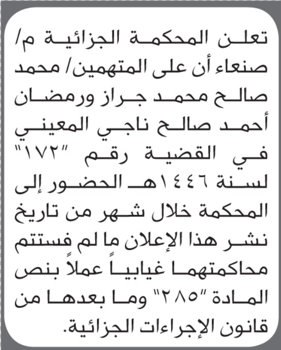 تعلن المحكمة الجزائية أن على المتهمين محمد جراز ورمضان المعيني الحضور إلى المحكمة إعلاناتمحاكم On ديسمبر 22, 2025 Share Share FacebookTwitterWhatsAppTelegramGoogle+البريد الإلكترونيPrint
