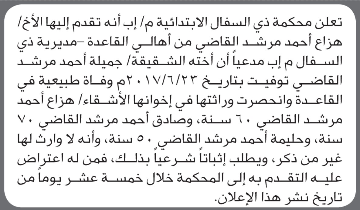 تعلن محكمة ذي السفال أن الأخ هزاع أحمد القاضي تقدم بدعوى انحصار وراثة إعلاناتمحاكم On ديسمبر 22, 2025 Share Share FacebookTwitterWhatsAppTelegramGoogle+البريد الإلكترونيPrint