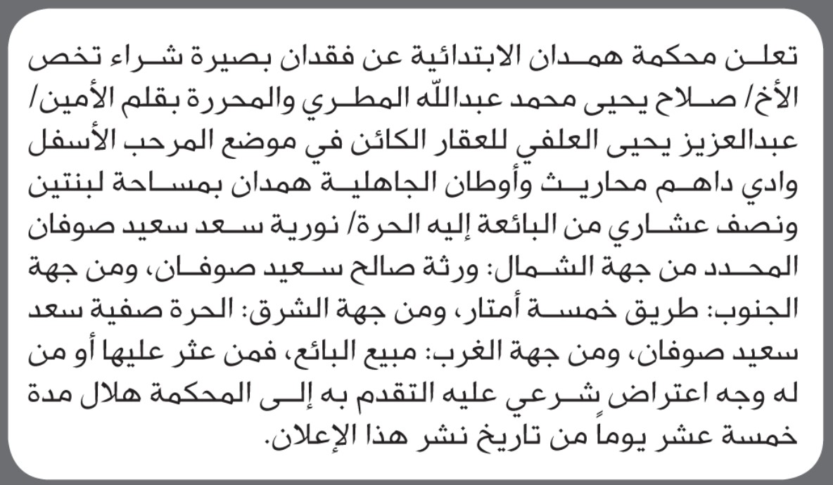 تعلن محكمة همدان عن فقدان بصيرة تخص الأخ صلاح يحيى المطري إعلاناتمحاكم On ديسمبر 22, 2025 Share Share FacebookTwitterWhatsAppTelegramGoogle+البريد الإلكترونيPrint