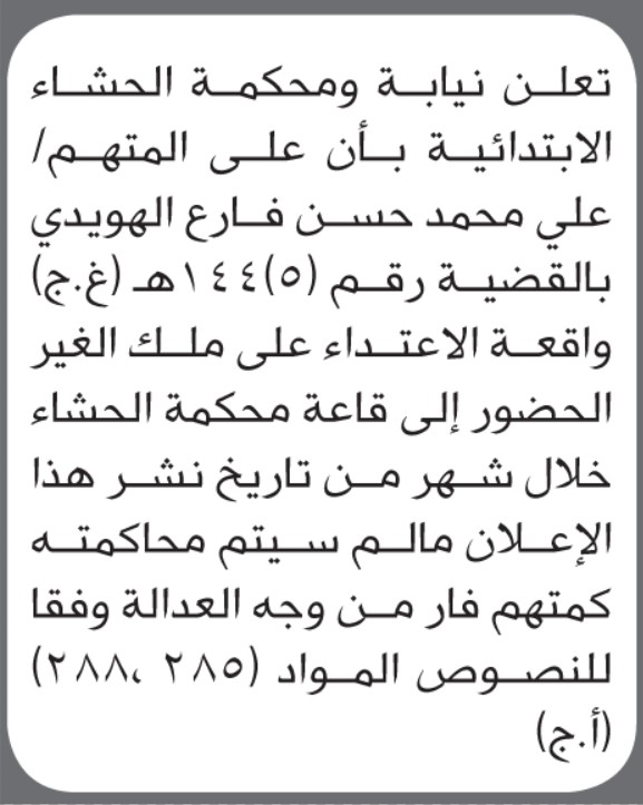 تعلن نيابة ومحكمة الحشاء أن على المتهم علي محمد الهويدي الحضور إلى المحكمة إعلاناتمحاكم On ديسمبر 22, 2025 Share Share FacebookTwitterWhatsAppTelegramGoogle+البريد الإلكترونيPrint