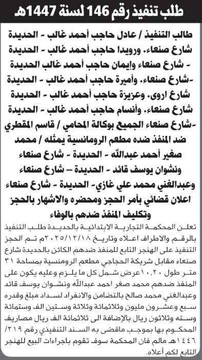 تعلن المحكمة التجارية بالحديدة عن حجز الهنجر التابع للمنفذ ضدهم مطعم الرومانسية إعلاناتمحاكم On ديسمبر 23, 2025 Share Share FacebookTwitterWhatsAppTelegramGoogle+البريد الإلكترونيPrint