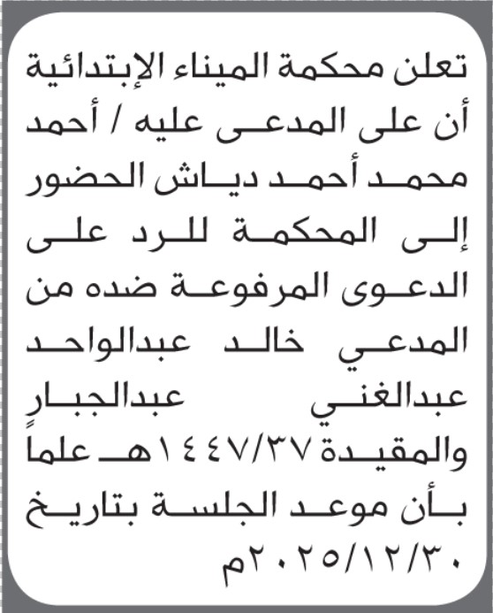 تعلن محكمة الميناء أن على المدعى عليه أحمد محمد دياش الحضور إلى المحكمة إعلاناتمحاكم On ديسمبر 23, 2025 Share Share FacebookTwitterWhatsAppTelegramGoogle+البريد الإلكترونيPrint