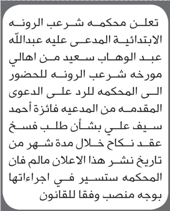 تعلن محكمة شرعب الرونه أن على المدعى عليه عبدالله سعيد الحضور الى المحكمة إعلاناتمحاكم On ديسمبر 23, 2025 Share Share FacebookTwitterWhatsAppTelegramGoogle+البريد الإلكترونيPrint