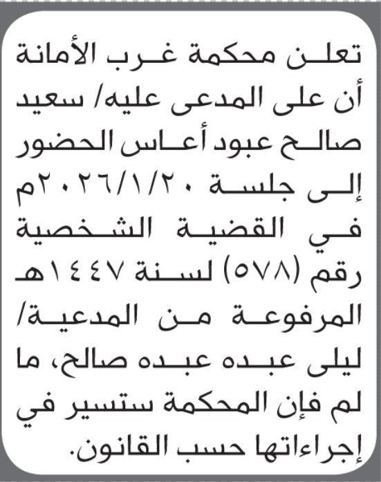 تعلن محكمة غرب الأمانة بأن على/ سعيد صالح أعاس الحضور إلى المحكمة إعلاناتمحاكم On ديسمبر 23, 2025 Share Share FacebookTwitterWhatsAppTelegramGoogle+البريد الإلكترونيPrint