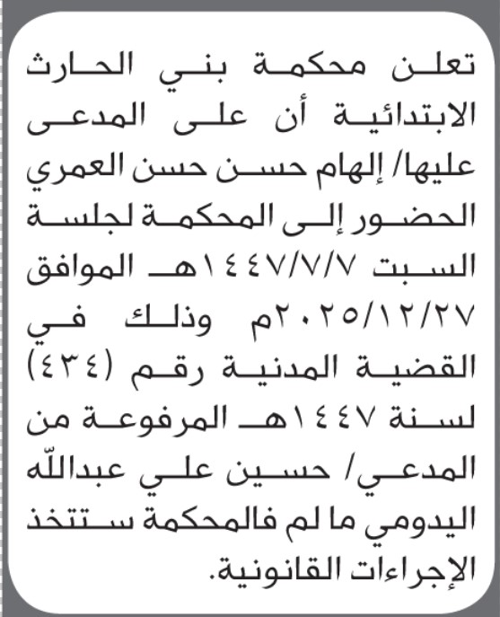 تعلن محكمة بني الحارث الابتدائية بأن على/ إلهام حسن العمري الحضور إلى المحكمة إعلاناتمحاكم On ديسمبر 23, 2025 Share Share FacebookTwitterWhatsAppTelegramGoogle+البريد الإلكترونيPrint
