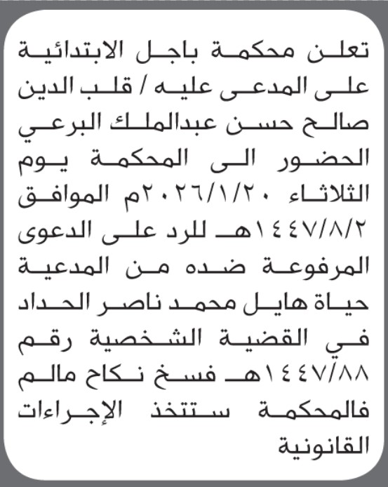 تعلن محكمة باجل الابتدائية بأن على/ قلب الدين صالح البرعي الحضور إلى المحكمة إعلاناتمحاكم On ديسمبر 23, 2025 Share Share FacebookTwitterWhatsAppTelegramGoogle+البريد الإلكترونيPrint
