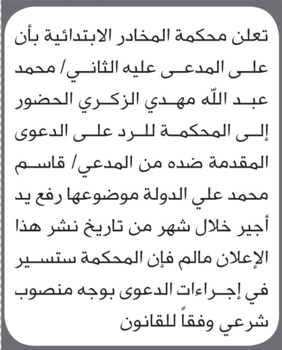 تعلن محكمة المخادر الابتدائية بأن على/محمد عبدالله الزكري الحضور إلى المحكمة إعلاناتمحاكم On ديسمبر 24, 2025 Share Share FacebookTwitterWhatsAppTelegramGoogle+البريد الإلكترونيPrint