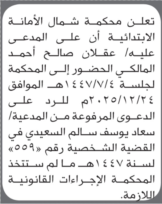 تعلن محكمة شمال الأمانة بأن على/ عقلان صالح المالكي الحضور إلى المحكمة إعلاناتمحاكم On ديسمبر 24, 2025 Share Share FacebookTwitterWhatsAppTelegramGoogle+البريد الإلكترونيPrint