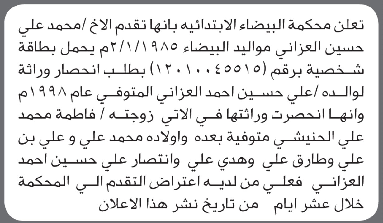 تعلن محكمة البيضاء أن الأخ محمد علي العزاني تقدم بدعوى انحصار وراثة إعلاناتمحاكم On ديسمبر 24, 2025 Share Share FacebookTwitterWhatsAppTelegramGoogle+البريد الإلكترونيPrint
