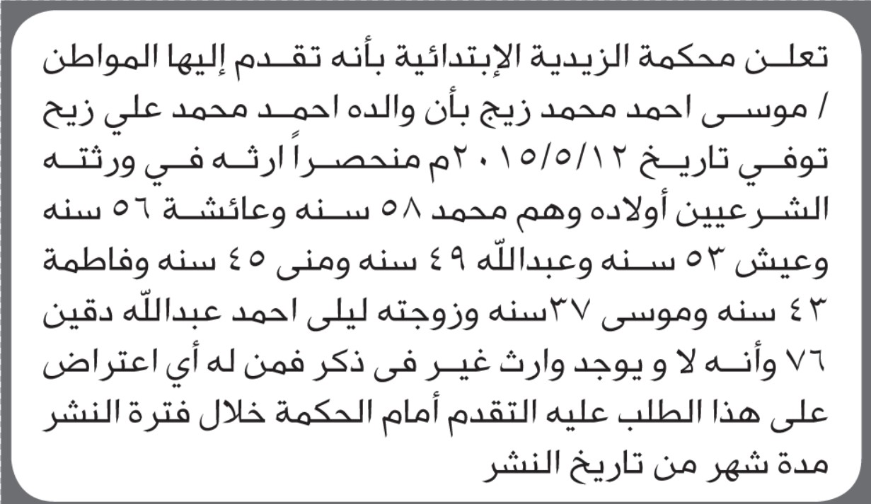 تعلن محكمة الزيدية أن الأخ موسى أحمد زيج تقدم بدعوى انحصار وراثة إعلاناتمحاكم On ديسمبر 24, 2025 Share Share FacebookTwitterWhatsAppTelegramGoogle+البريد الإلكترونيPrint