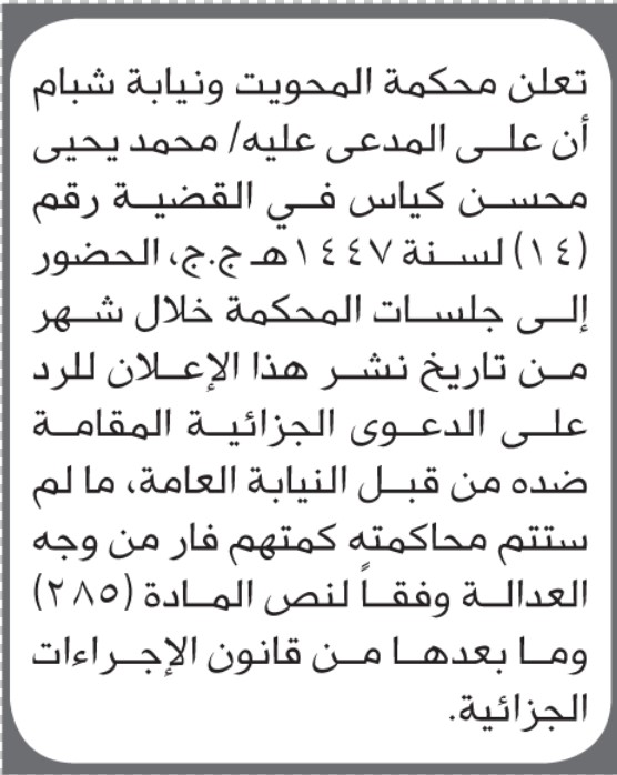 تعلن محكمة المحويت أن على المدعى عليه محمد كياس الحضور إلى المحكمة إعلاناتمحاكم On ديسمبر 24, 2025 Share Share FacebookTwitterWhatsAppTelegramGoogle+البريد الإلكترونيPrint