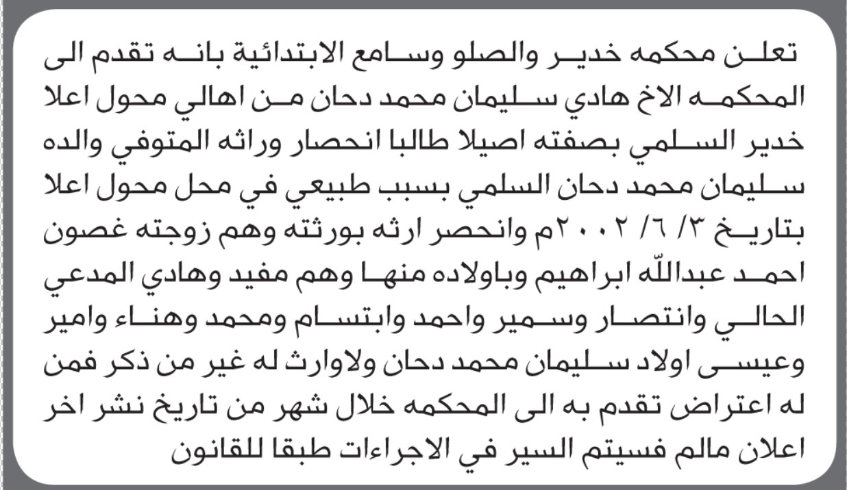 تعلن محكمة خدير أن الأخ هادي سليمان دحان تقدم بدعوى انحصار وراثة إعلاناتمحاكم On ديسمبر 24, 2025 Share Share FacebookTwitterWhatsAppTelegramGoogle+البريد الإلكترونيPrint