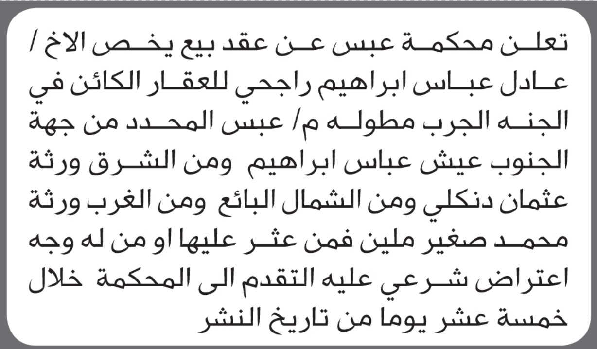 تعلن محكمة عبس عن فقدان عقد بيع يخص الأخ عادل عباس راجحي إعلاناتمحاكم On ديسمبر 24, 2025 Share Share FacebookTwitterWhatsAppTelegramGoogle+البريد الإلكترونيPrint