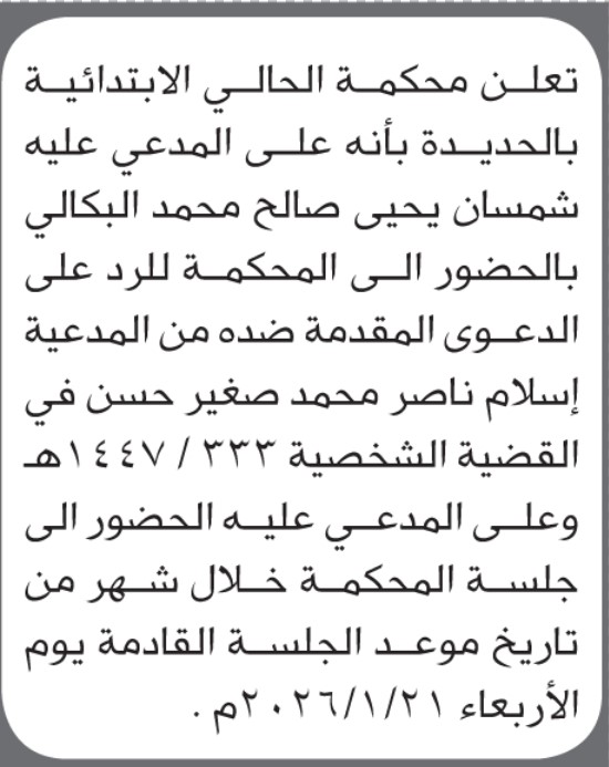 تعلن محكمة الحالي الحديده أن على المدعى عليه شمسان البكالي الحضور الى المحكمة إعلاناتمحاكم On ديسمبر 24, 2025 Share Share FacebookTwitterWhatsAppTelegramGoogle+البريد الإلكترونيPrint