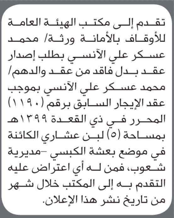 تقدم الى مكتب الأوقاف ورثة محمد الأنسي بطلب إصدار عقد بدل فاقد إعلاناتمحاكم On ديسمبر 24, 2025 Share Share FacebookTwitterWhatsAppTelegramGoogle+البريد الإلكترونيPrint