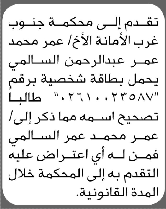 تعلن محكمة جنوب غرب الامانة بأن الأخ/ عمر محمد السالمي تقدم إليها بطلب تصحيح اسمه إعلاناتمحاكم On ديسمبر 25, 2025 Share Share FacebookTwitterWhatsAppTelegramGoogle+البريد الإلكترونيPrint
