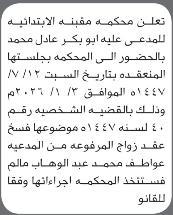 تعلن محكمة مقبنة أن على المدعى عليه أبوبكر عادل الحضور إلى المحكمة إعلاناتمحاكم On ديسمبر 26, 2025 Share Share FacebookTwitterWhatsAppTelegramGoogle+البريد الإلكترونيPrint
