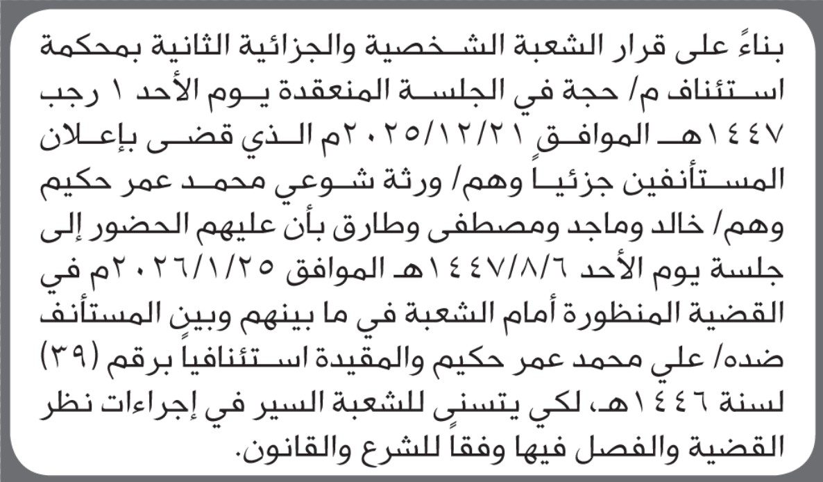 تعلن محكمة استئناف م/ حجة بأن على ورثة/ شوعي محمد حكيم الحضور إلى المحكمة إعلاناتمحاكم On ديسمبر 25, 2025 Share Share FacebookTwitterWhatsAppTelegramGoogle+البريد الإلكترونيPrint