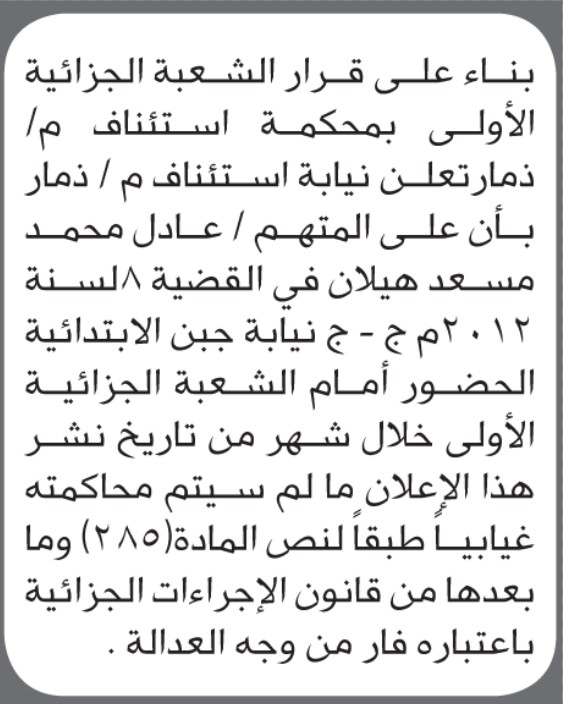 تعلن محكمة استئناف م/ ذمار بأن على/ عادل محمد هيلان الحضور إلى المحكمة إعلاناتمحاكم On ديسمبر 26, 2025 Share Share FacebookTwitterWhatsAppTelegramGoogle+البريد الإلكترونيPrint