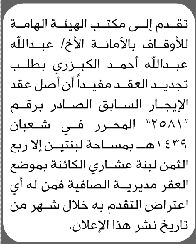 تعلن الهيئة العامة للأوقاف بالأمانة بأن الأخ/ عبدالله أحمد الكبزري تقدم إليها بطلب تجديد عقد الإيجار إعلاناتالسجل العقاري On ديسمبر 27, 2025 Share Share FacebookTwitterWhatsAppTelegramGoogle+البريد الإلكترونيPrint