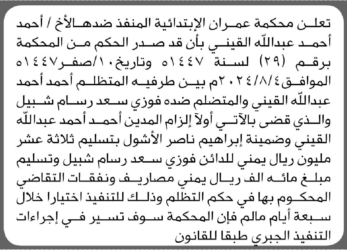 تعلن محكمة عمران الابتدائية بأن على/ أحمد عبدالله القيني تسليم الدين الذي عليه إعلاناتمحاكم On ديسمبر 28, 2025 Share Share FacebookTwitterWhatsAppTelegramGoogle+البريد الإلكترونيPrint