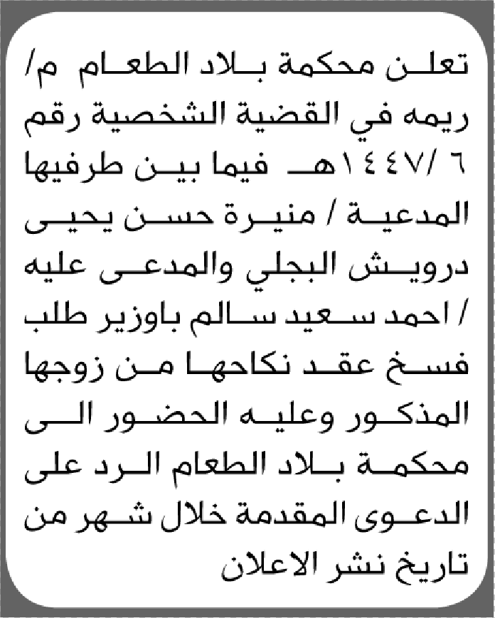 تعلن محكمة بلاد الطعام م/ ريمة بأن على/ أحمد سعيد باوزير الحضور إلى المحكمة إعلاناتمحاكم On ديسمبر 28, 2025 Share Share FacebookTwitterWhatsAppTelegramGoogle+البريد الإلكترونيPrint