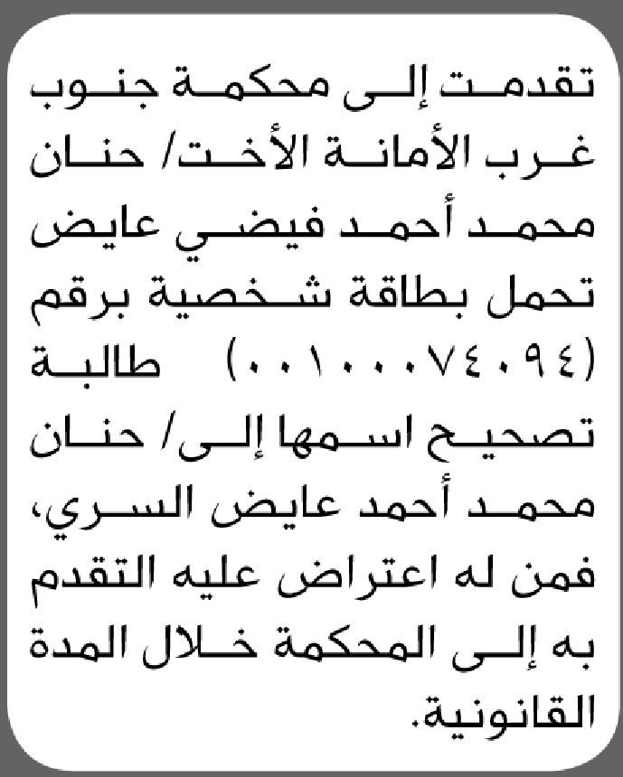 تعلن محكمة جنوب غرب الأمانة بأن الأخت/ حنان محمد عايض تقدمت إليها بطلب تصحيح اسمها إعلاناتمحاكم On ديسمبر 28, 2025 Share Share FacebookTwitterWhatsAppTelegramGoogle+البريد الإلكترونيPrint