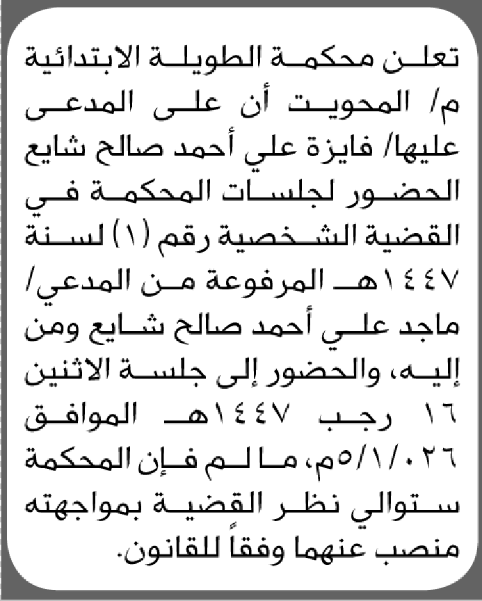 تعلن محكمة الطويلة أن على المدعى عليها فايزة علي شايع الحضور إلى المحكمة إعلاناتمحاكم On ديسمبر 28, 2025 Share Share FacebookTwitterWhatsAppTelegramGoogle+البريد الإلكترونيPrint