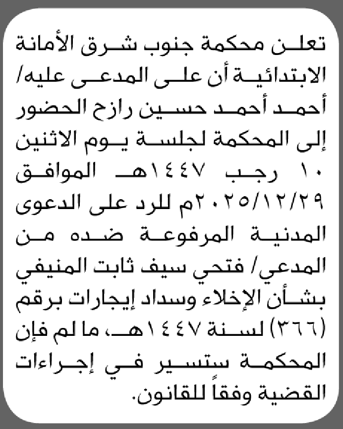 تعلن محكمة جنوب شرق الأمانة أن على المدعى عليه أحمد رازح الحضور إلى المحكمة إعلاناتمحاكم On ديسمبر 28, 2025 Share Share FacebookTwitterWhatsAppTelegramGoogle+البريد الإلكترونيPrint