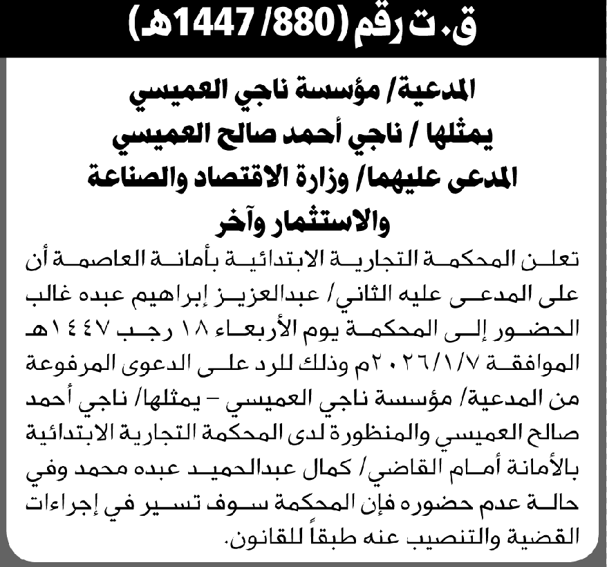 تعلن المحكمة التجارية بالأمانة أن على المدعى عليه عبدالعزيز غالب الحضور الى المحكمة إعلاناتمحاكم On ديسمبر 28, 2025 Share Share FacebookTwitterWhatsAppTelegramGoogle+البريد الإلكترونيPrint
