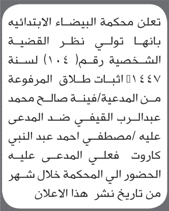 تعلن محكمة البيضاء أن على المدعى عليه مصطفى كاروت الحضور الى المحكمة إعلاناتمحاكم On ديسمبر 29, 2025 Share Share FacebookTwitterWhatsAppTelegramGoogle+البريد الإلكترونيPrint