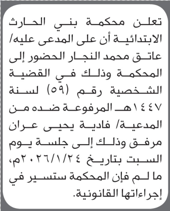 تعلن محكمة بني الحارث أن على المدعى عليه عاتق النجار الحضور الى المحكمة إعلاناتمحاكم On ديسمبر 29, 2025 Share Share FacebookTwitterWhatsAppTelegramGoogle+البريد الإلكترونيPrint