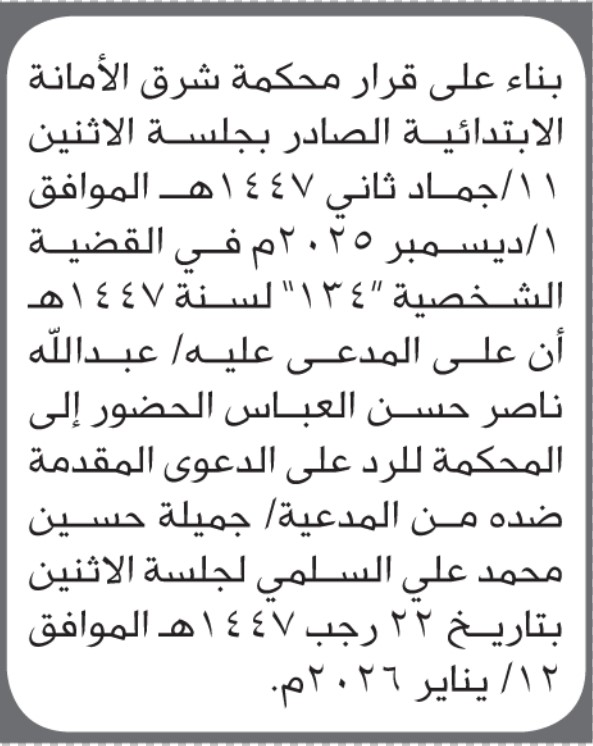 تعلن محكمة شرق الأمانة أن على المدعي عليه عبدالله العباس الحضور الى المحكمة إعلاناتمحاكم On ديسمبر 30, 2025 Share Share FacebookTwitterWhatsAppTelegramGoogle+البريد الإلكترونيPrint