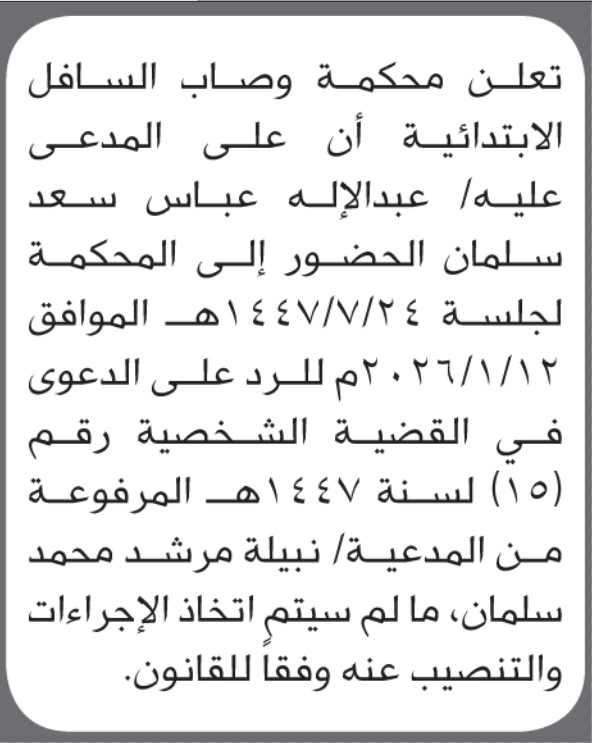 تعلن محكمة وصاب السافل الابتدائية بأن على/ عبدالإله عباس سلمان الحضور إلى المحكمة إعلاناتمحاكم On ديسمبر 30, 2025 Share Share FacebookTwitterWhatsAppTelegramGoogle+البريد الإلكترونيPrint