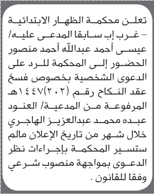 تعلن محكمة الظاهر الابتدائية بأن على/ عيسى أحمد منصور الحضور إلى المحكمة إعلاناتمحاكم On ديسمبر 30, 2025 Share Share FacebookTwitterWhatsAppTelegramGoogle+البريد الإلكترونيPrint
