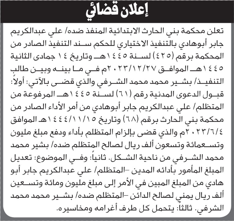 تعلن محكمة بني الحارث للمنفذ ضده علي عبدالله أبو هادي بالتنفيذ الإختياري للحكم إعلاناتمحاكم On ديسمبر 30, 2025 Share Share FacebookTwitterWhatsAppTelegramGoogle+البريد الإلكترونيPrint