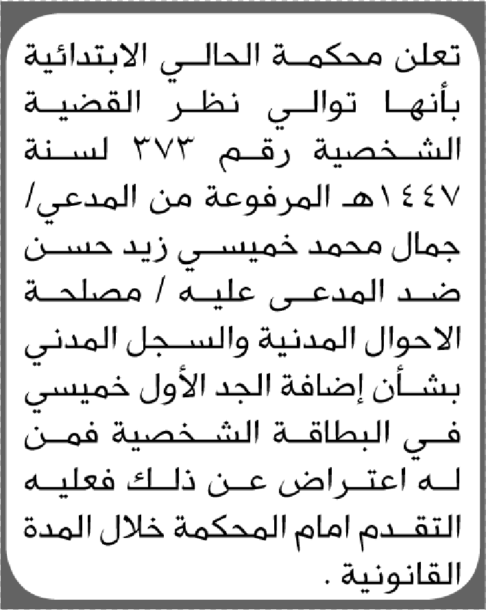تعلن محكمة الحالي الابتدائية بأن الأخ/ جمال محمد حسن تقدم إليها بطلب إضافة الجد الأول إعلاناتمحاكم On ديسمبر 31, 2025 Share Share FacebookTwitterWhatsAppTelegramGoogle+البريد الإلكترونيPrint
