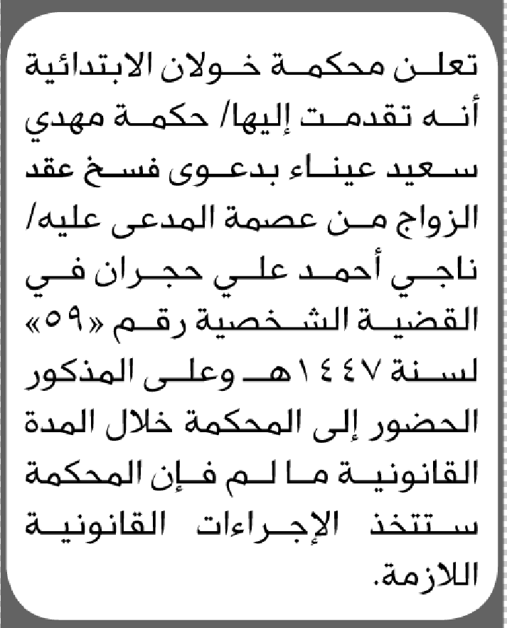 تعلن محكمة خولان أن على المدعي ناجي حجران الحضور الى المحكمة إعلاناتمحاكم On ديسمبر 31, 2025 Share Share FacebookTwitterWhatsAppTelegramGoogle+البريد الإلكترونيPrint