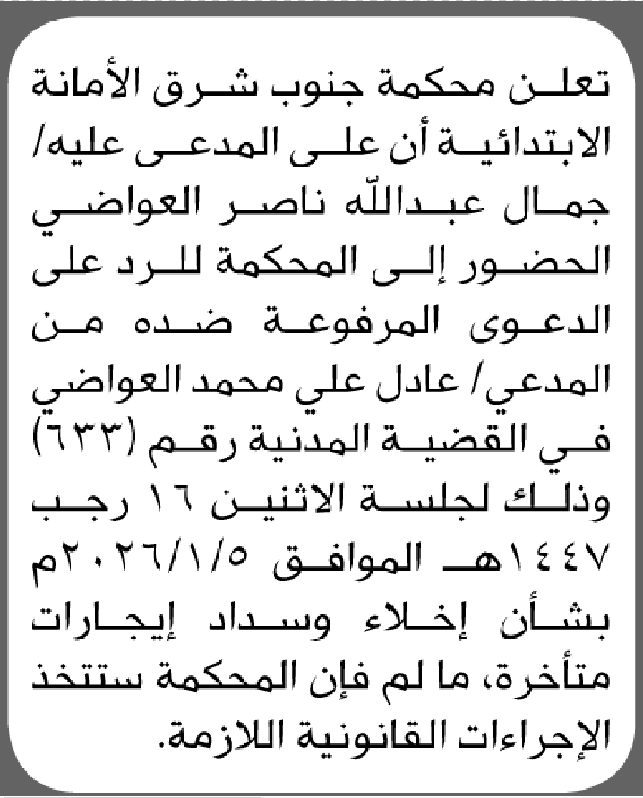 تعلن محكمة جنوب شرق الأمانة أن على المدعى عليه جمال العواضي الحضور إلى المحكمة إعلاناتمحاكم On يناير 1, 2026 Share Share FacebookTwitterWhatsAppTelegramGoogle+البريد الإلكترونيPrint
