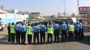 نظم منتسبو إدارة شرطة مرور محافظة تعز اليوم، وقفة احتجاجية تنديداً بالإساءة الأمريكية للقرآن الكريم.