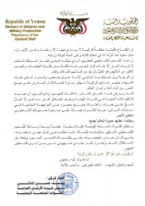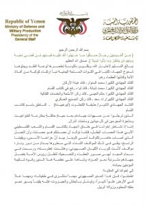 ببالغ التسليم لاختيار الله، وبقلوبٍ مكلومةٍ تعتصرها لوعة الفقد ويملؤها شموخ الجهاد، تلقينا في القوات المسلحة اليمنية نبأ ارتقاء كوكبة من أفذاذ الأمة وقادتها العظماء وهم:
