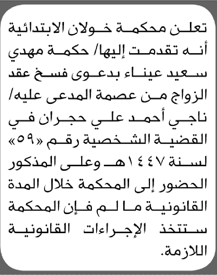 تعلن محكمة خولان الابتدائية بأن على/ ناجي أحمد حجران الحضور إلى المحكمة إعلاناتمحاكم On يناير 1, 2025 Share Share FacebookTwitterWhatsAppTelegramGoogle+البريد الإلكترونيPrint