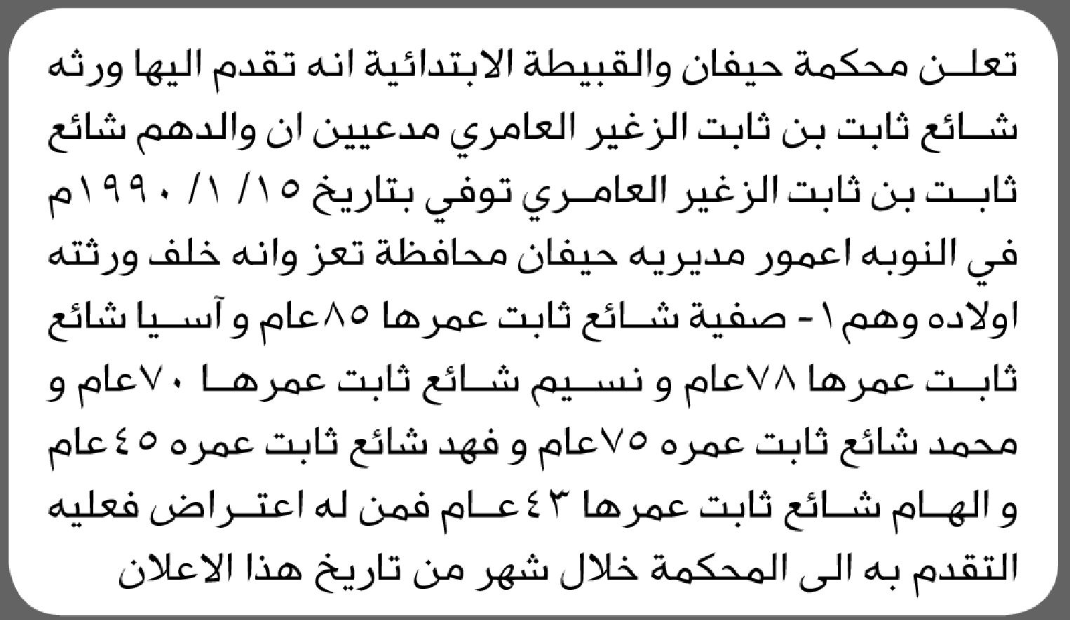 تعلن محكمة حيفان أن الأخوة ورثة شائع العامري تقدموا بدعوى انحصار وراثة إعلاناتمحاكم On يناير 2, 2026 Share Share FacebookTwitterWhatsAppTelegramGoogle+البريد الإلكترونيPrint