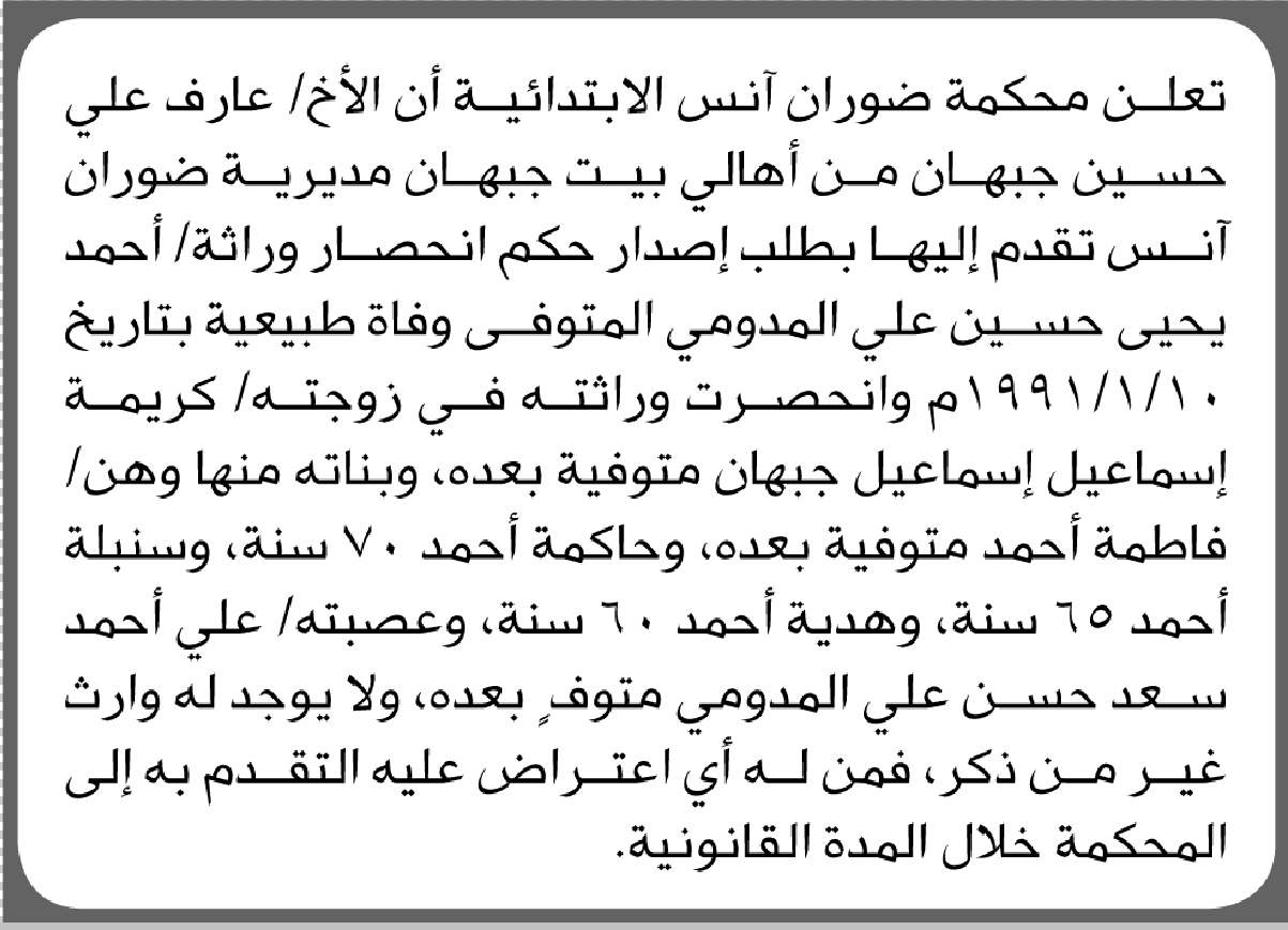 تعلن محكمة ضوران آنس أن الأخ عارف جبهان تقدم بدعوى انحصار وراثة إعلاناتمحاكم On يناير 2, 2026 Share Share FacebookTwitterWhatsAppTelegramGoogle+البريد الإلكترونيPrint