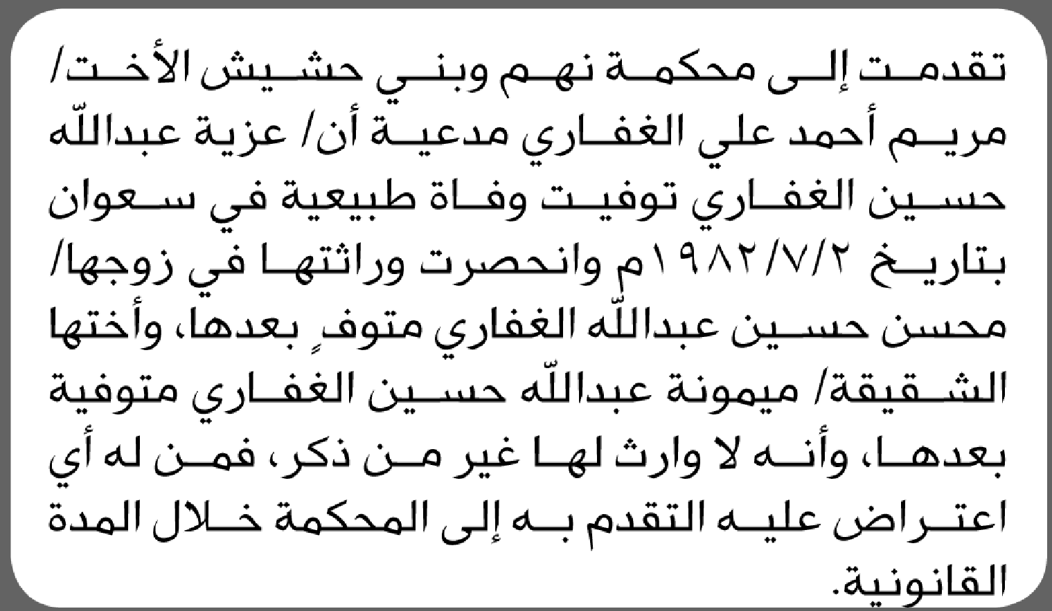 تعلن محكمة نهم أن الأخت مريم أحمد الغفاري تقدمت بدعوى انحصار وراثة إعلاناتمحاكم On يناير 2, 2026 Share Share FacebookTwitterWhatsAppTelegramGoogle+البريد الإلكترونيPrint