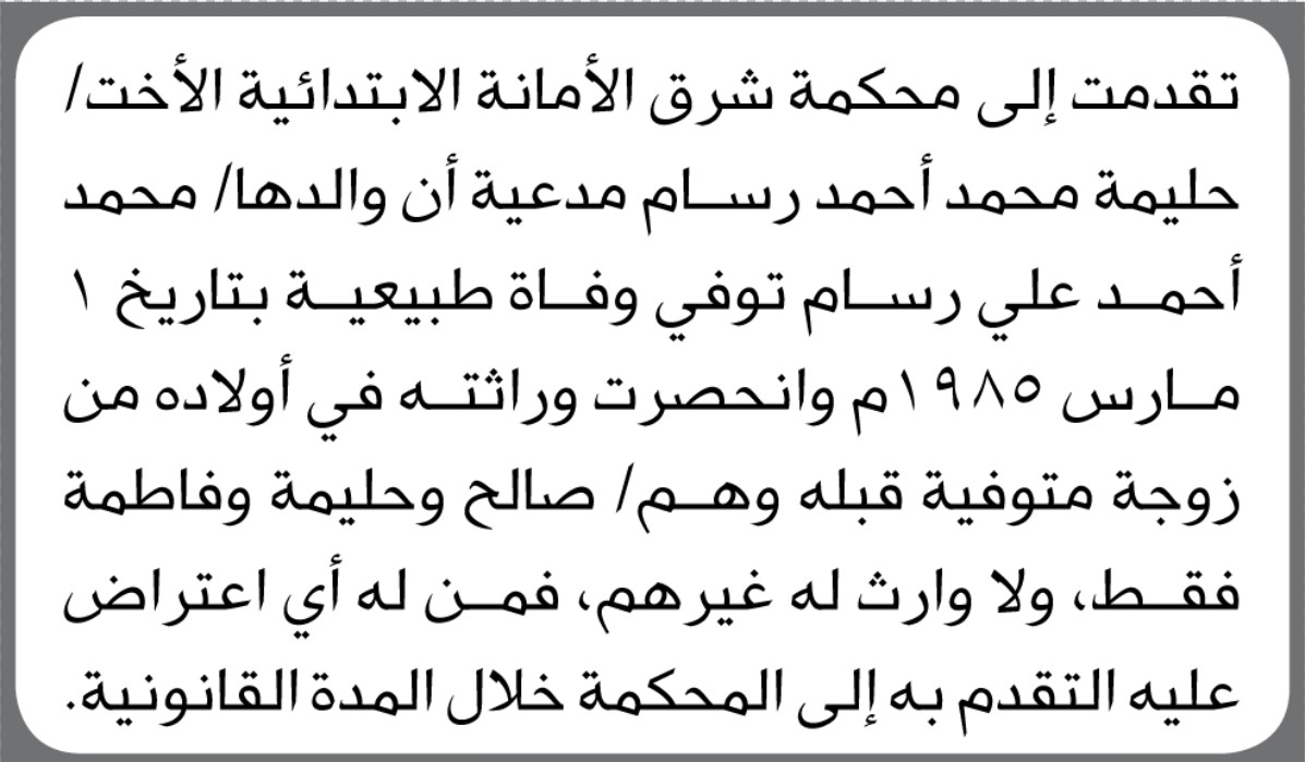تعلن محكمة شرق الأمانة أن الأخت حليمة محمد رسام تقدمت بدعوى انحصار وراثة إعلاناتمحاكم On يناير 4, 2026 Share Share FacebookTwitterWhatsAppTelegramGoogle+البريد الإلكترونيPrint
