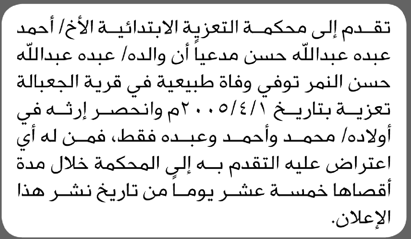 تعلن محكمة التعزية أن الأخ أحمد عبده عبدالله تقدم بدعوى انحصار وراثة إعلاناتمحاكم On يناير 5, 2026 Share Share FacebookTwitterWhatsAppTelegramGoogle+البريد الإلكترونيPrint