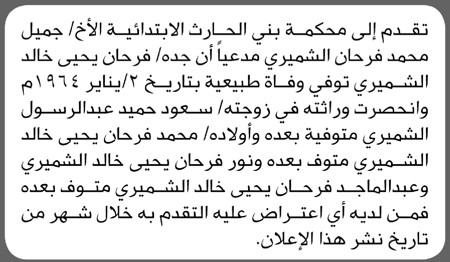 تعلن محكمة بني الحارث أن الأخ جميل الشميري تقدم بدعوى انحصار وراثة إعلاناتمحاكم On يناير 5, 2026 Share Share FacebookTwitterWhatsAppTelegramGoogle+البريد الإلكترونيPrint