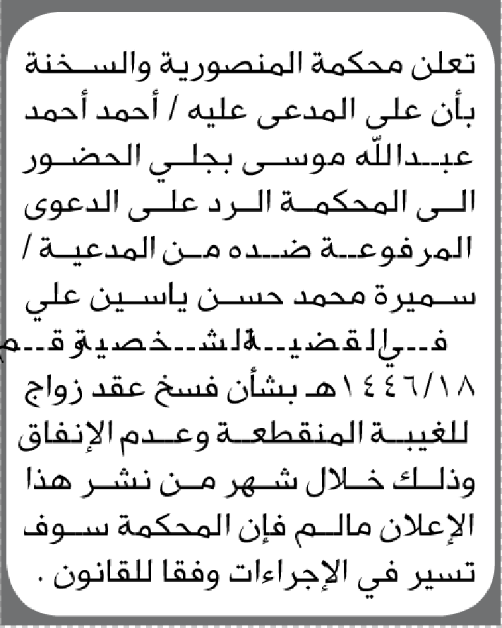 تعلن محكمة المنصورية أن على المدعى عليه أحمد أحمد بجلي الحضور إلى المحكمة إعلاناتمحاكم On يناير 6, 2026 Share Share FacebookTwitterWhatsAppTelegramGoogle+البريد الإلكترونيPrint